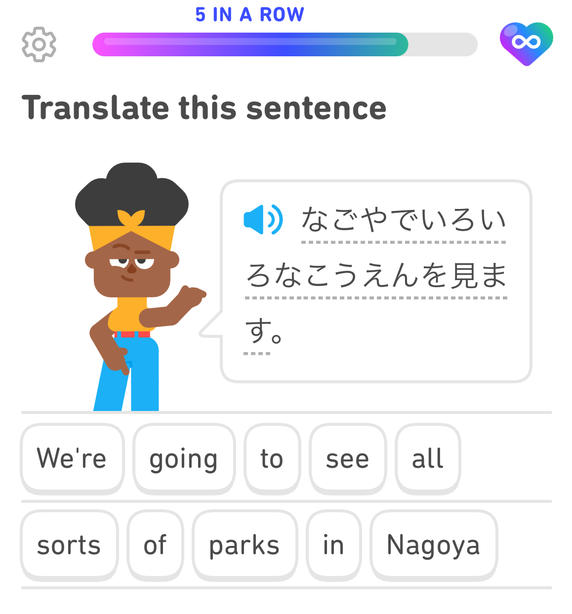 I am actively learning Japanese on Duolingo at the moment. It’s always a refreshing break to switch my focus from computer languages to learning a natural language.