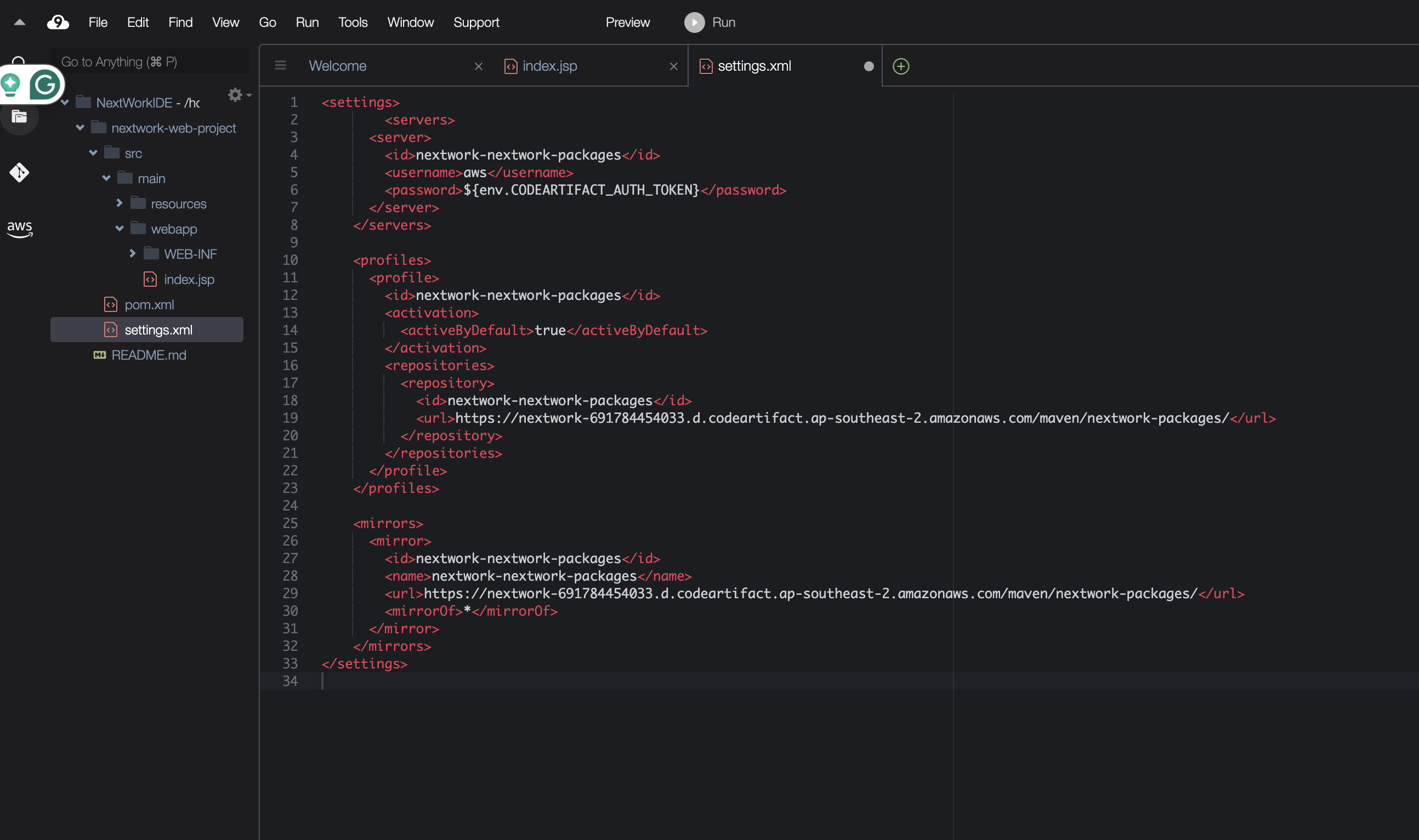 - Add a settings.xml file to the root of the project file in Cloud9.
