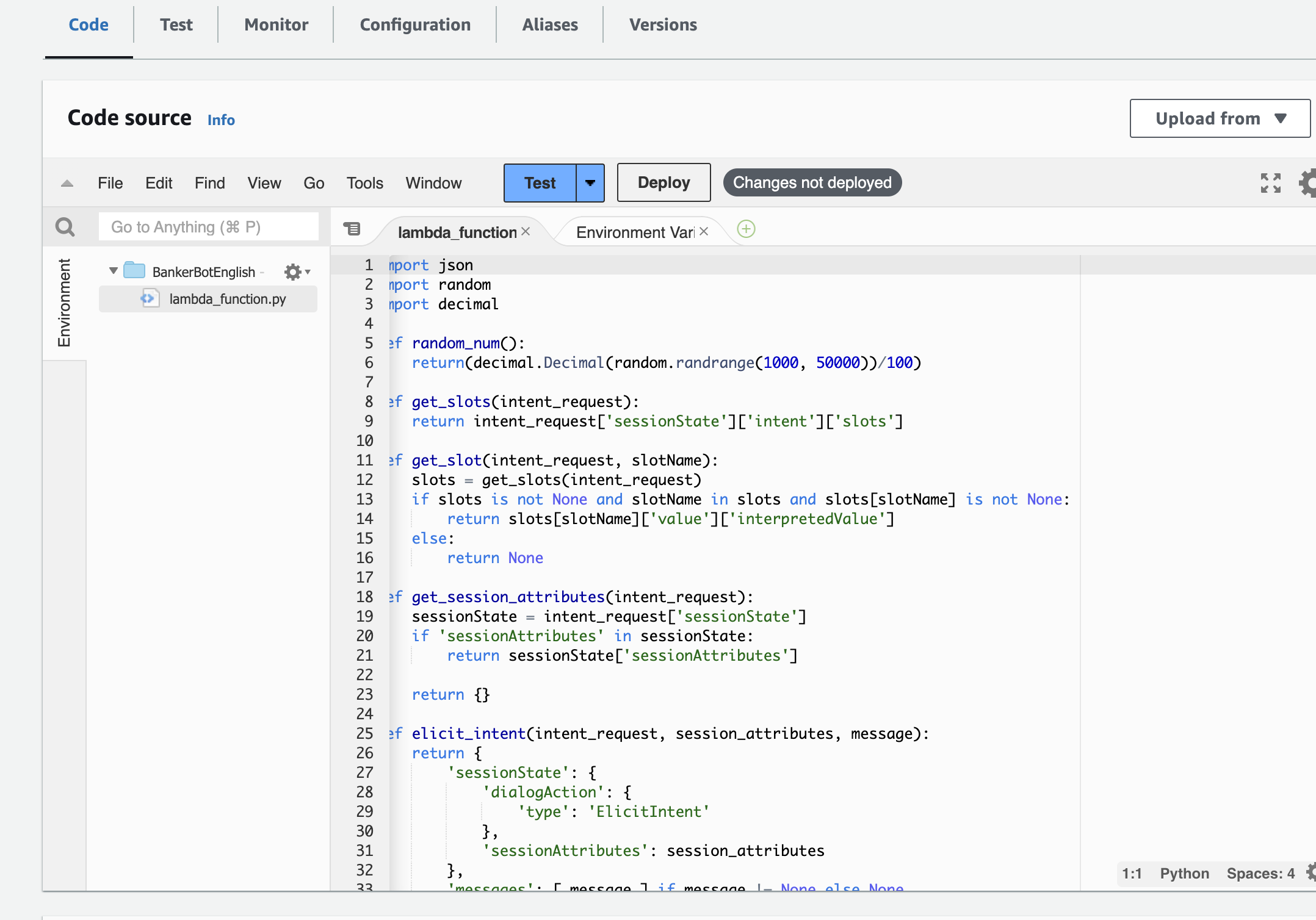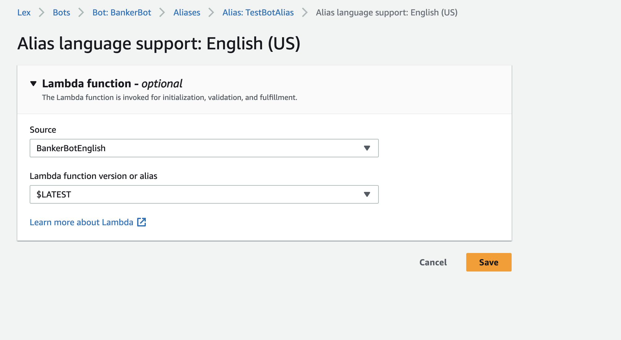 - Find the Alias on the left-side panel of the Lex console page and connect to the Lambda Function that just setup.