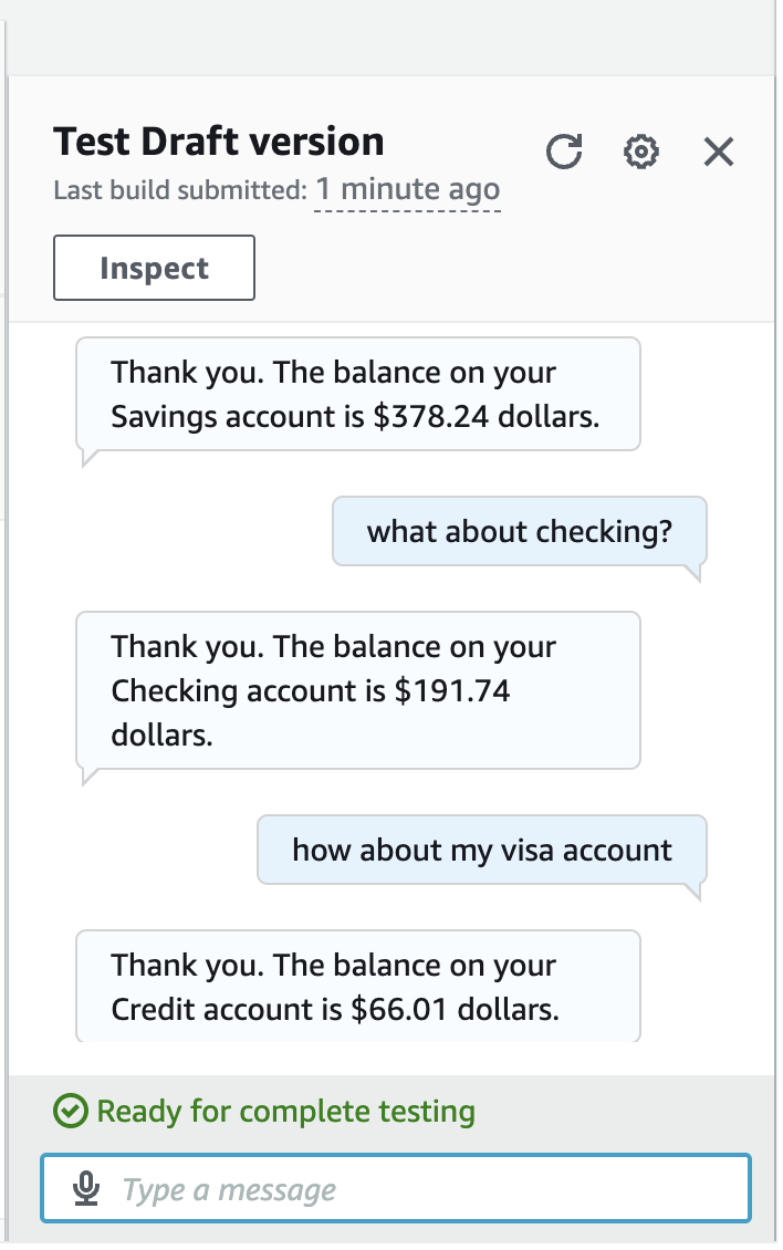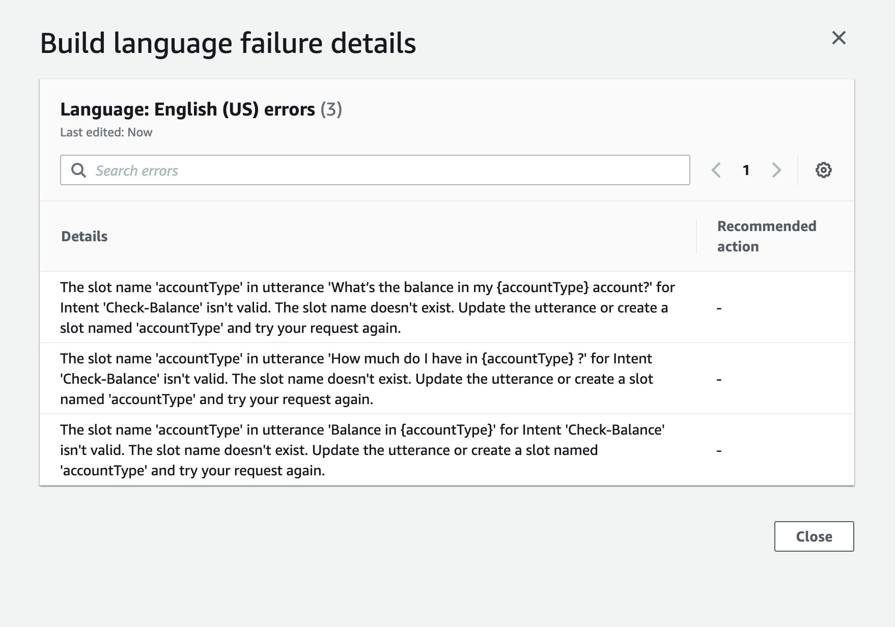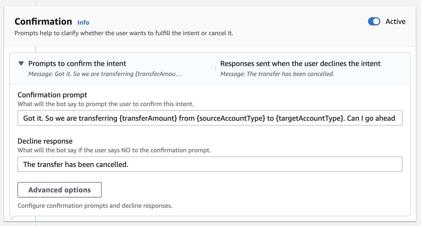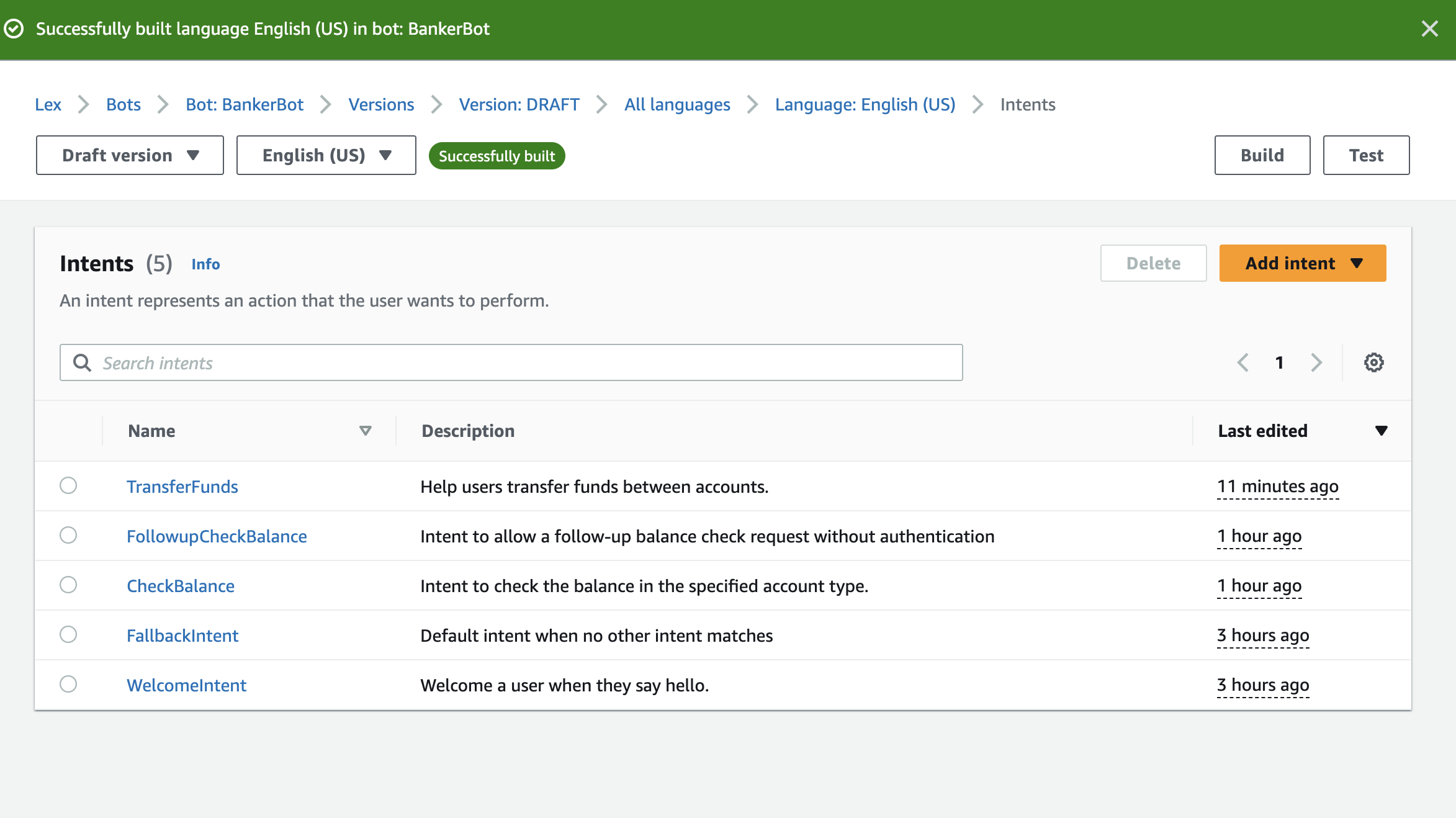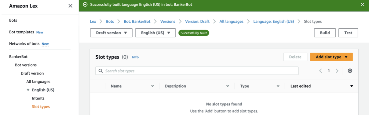 Now the slots are ready, time to build the intent for checking balance in the specified account type.