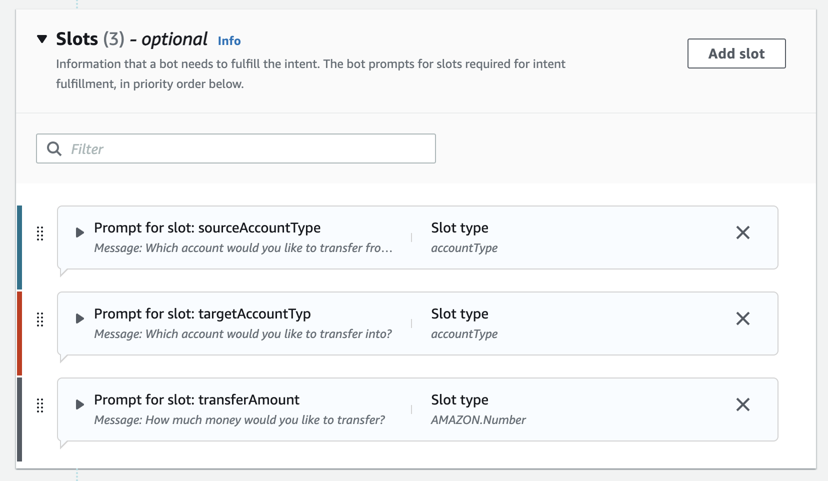In order to know which account a user wants to check, we need to set up slots that tells the bot what information we need to gather from the user.
