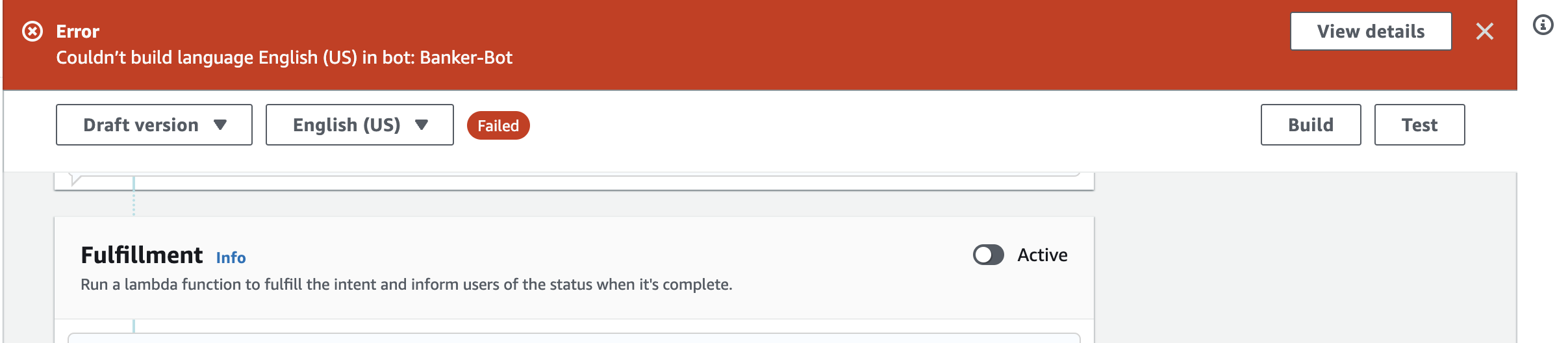 I came across the error of failing to build the bot twice when I was trying to apply the "AccountType" slot types to the CheckBalance intent and when I was connecting the Lambda function to the Amazon Lex.