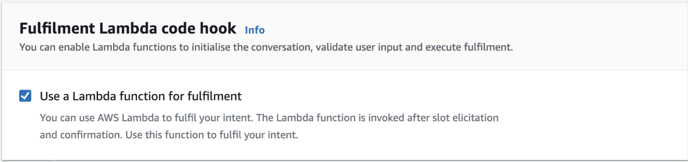 Within the fulfilment panel, activate the setting to Use a Lambda function for fulfilment.