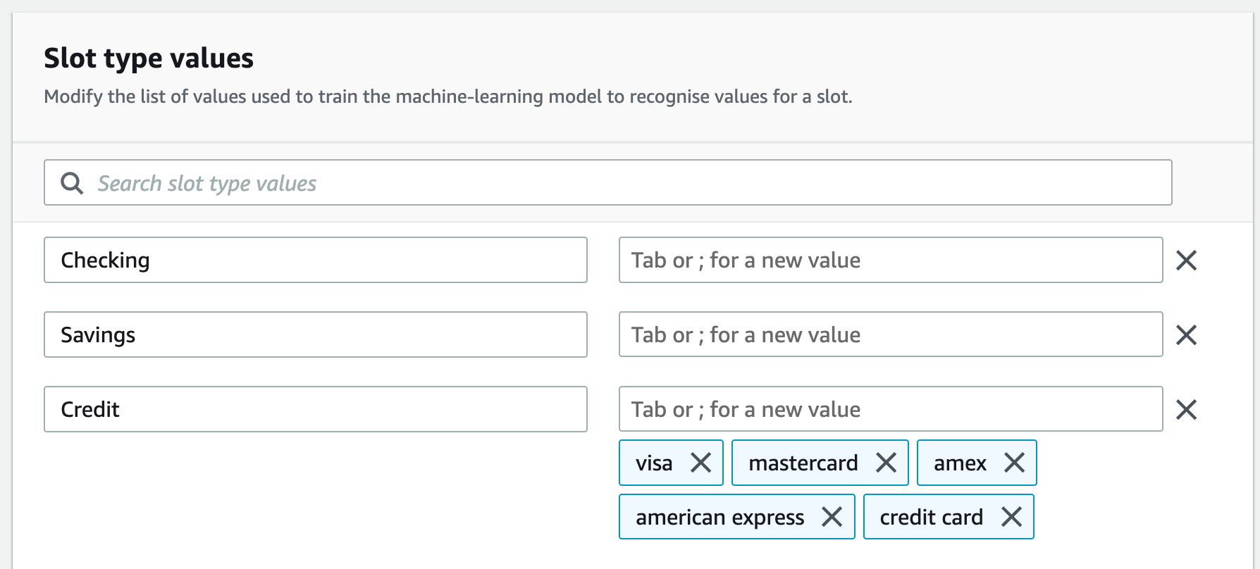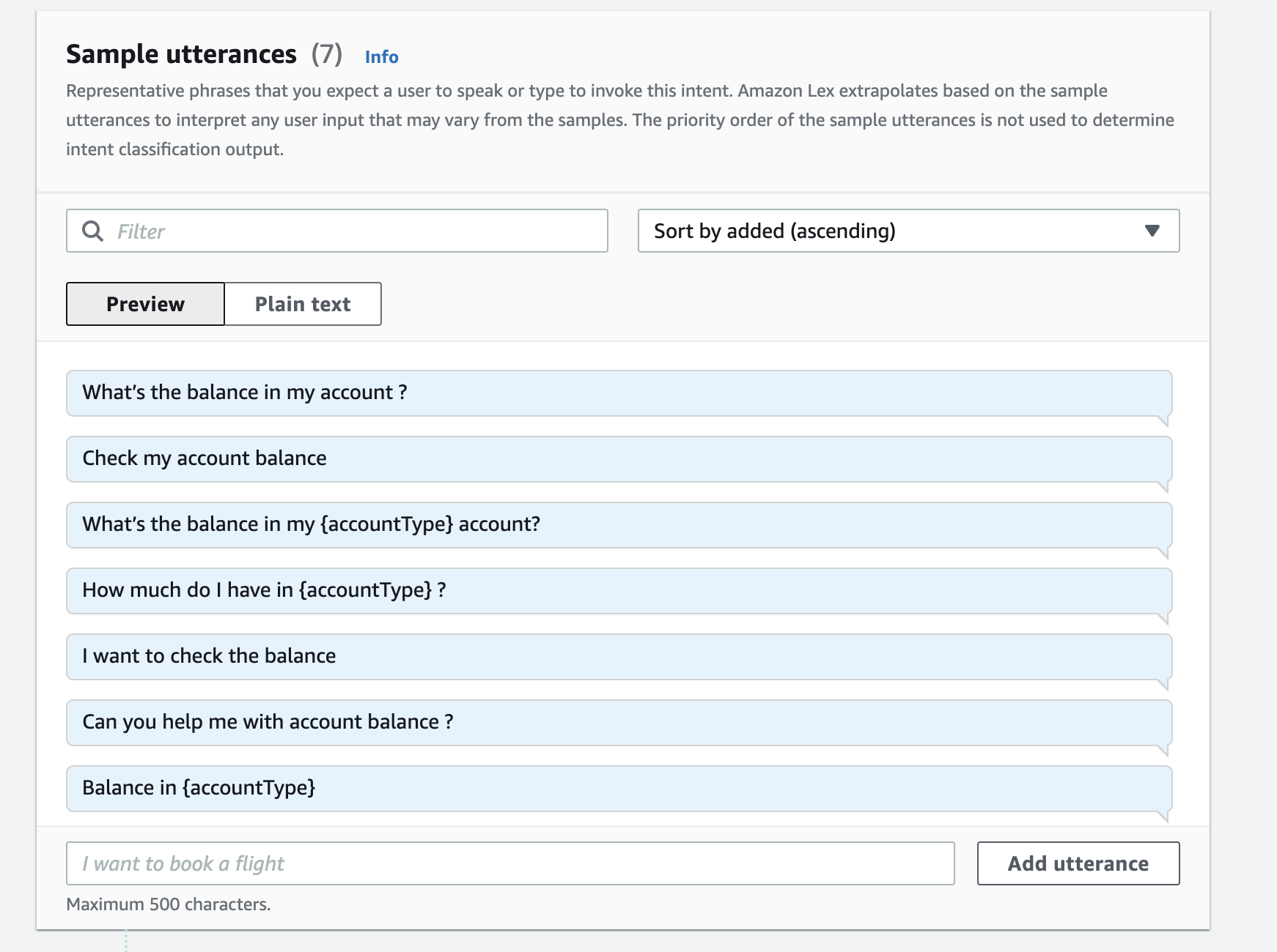 You'll notice that some of the utterances contains {accountTypes}. This is to trigger the Amazon Lex to look for slot values from the user's input.