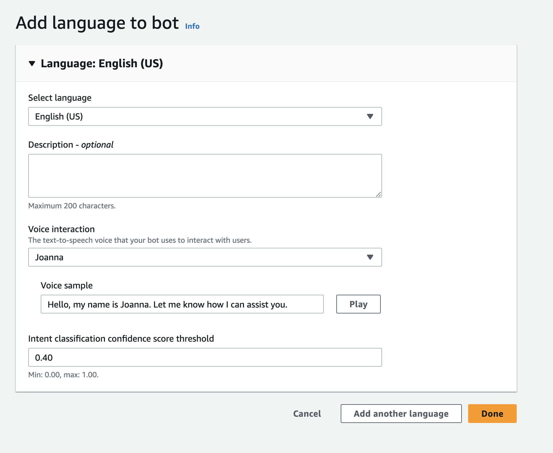 - Choose "Create a role with basic Amazon Lex permissions", This will create a policy that gives Amazon Lex permissions to call other AWS services, such as Lambda.