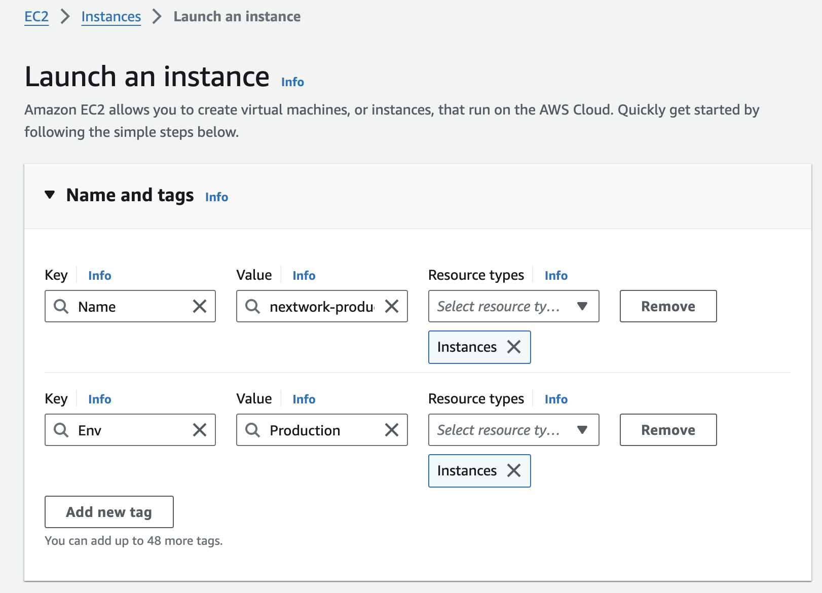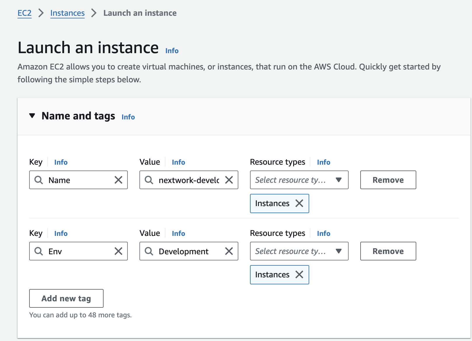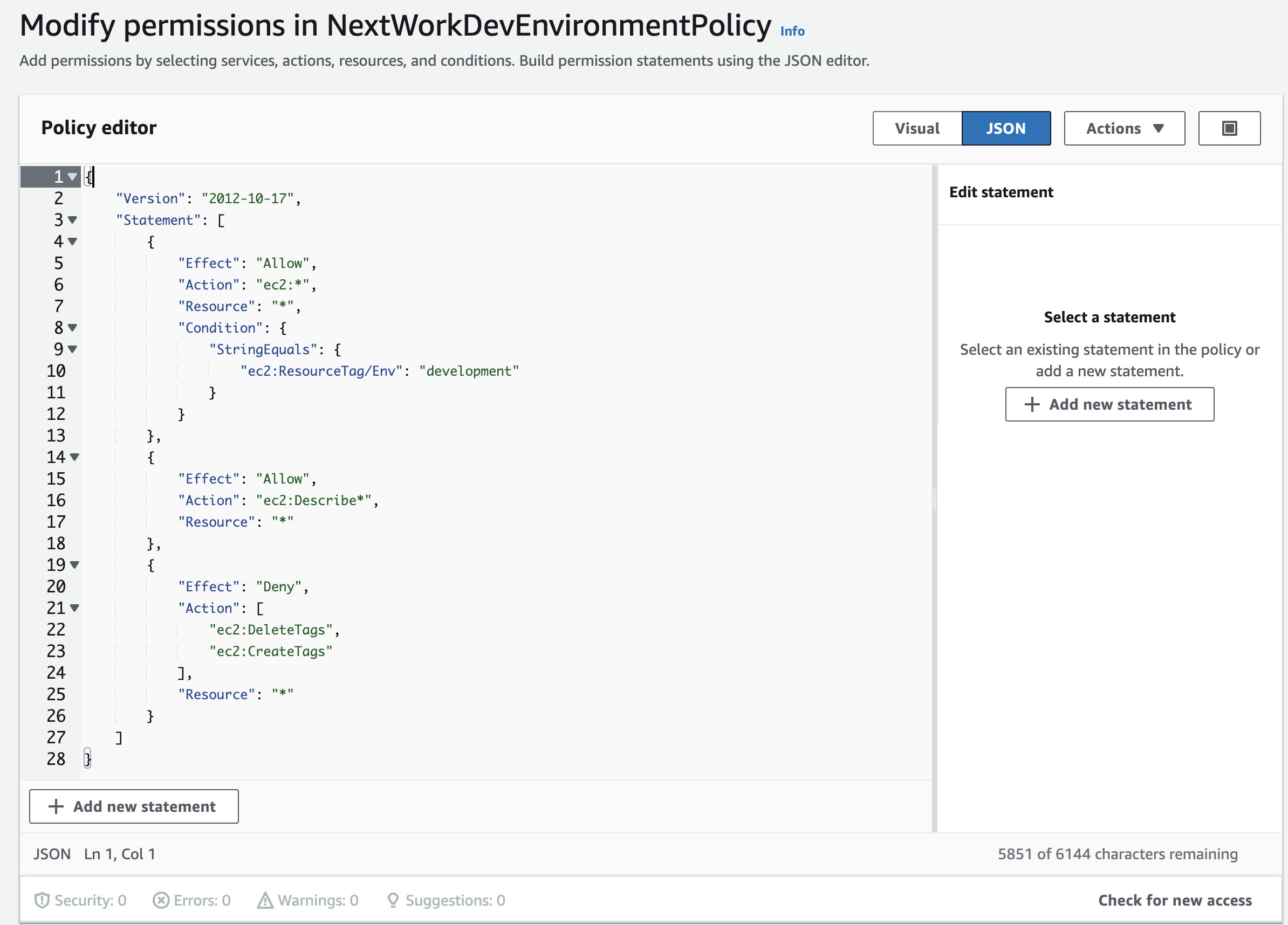 I've set up two EC2 instances, one with the tag of "development" and one with "production" to test the effectiveness of the permission settings.
