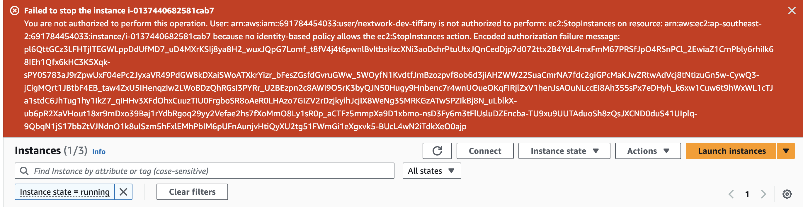 - Now with my IAM Policy, IAM User Group and IAM User all set up, I logged into my AWS account as the new user and tried to stop the production EC2 instance.The red banner tells me that I'm not authorised to stop this instance, which means the policy works!