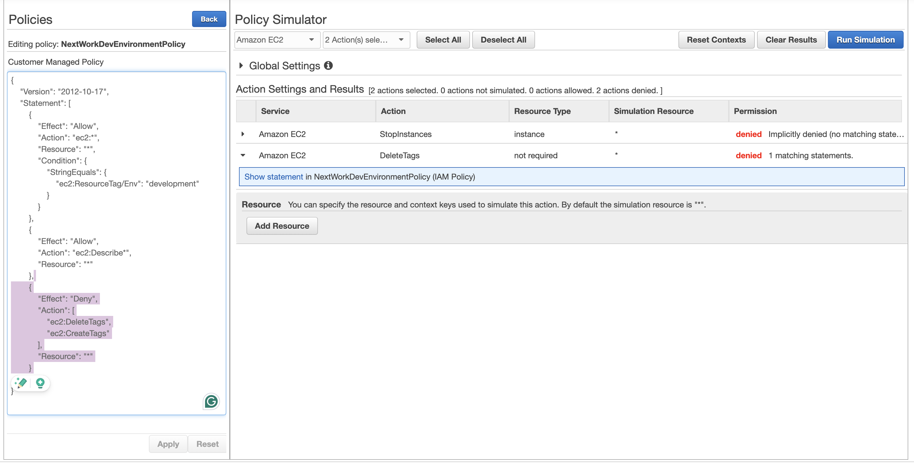 - I also used the IAM Policy Simulator to test out the policy in a more effective way. It is very handy as it is able to show exactly which statement in the IAM policy is blocking the user.